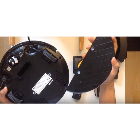 Đối với Bình chứa nước để lau nhà chúng ta sẽ lắp thêm cho robot khăn lau nhà dưới robot sao cho 4 điểm nút trên khăn khớp với 4 nút trên máy và bấm vào các điểm để chắc chắn khăn đã lắp chắc chắn vào máy. Trước khi lau nhà chú ý phải đổ nước vào bình đựng nước bằng cách tháo nắp bình đựng nước và đổ nước trực tiếp vào bình và đậy nắp lại.