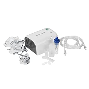 - Bình phun sương, 2 ống khí, mặt nạ người lớn, mặt nạ trẻ em, ống ngậm có góc cạnh, miếng dán mũi, 5 bộ lọc thay thế, nước rửa mũi, túi ren