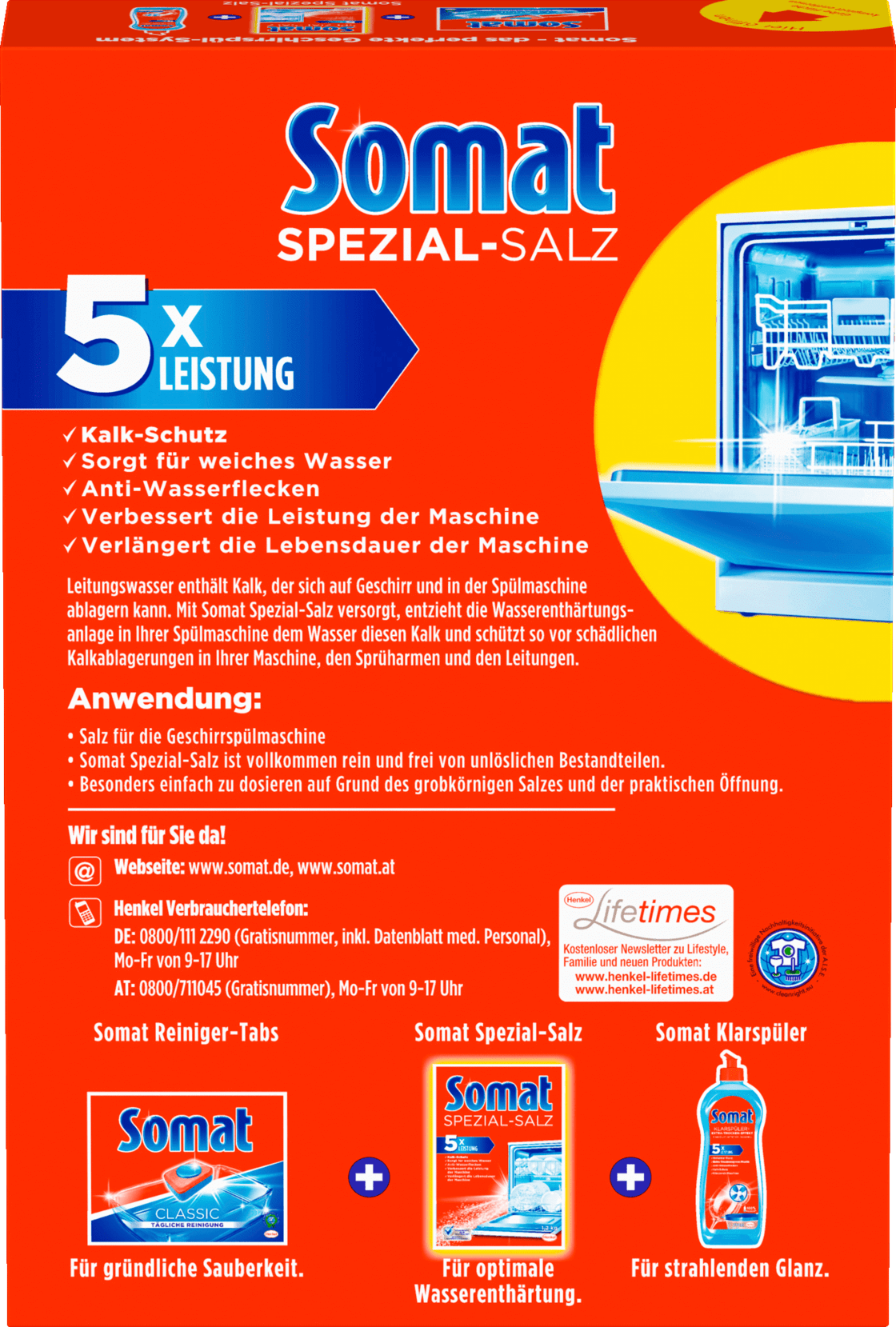 Muối Somat hoàn toàn tinh khiết và hạt thô hỗ trợ làm mềm nước trong máy rửa chén và bảo vệ tối ưu khỏi việc hình thành lớp vôi hóa bám vào máy.