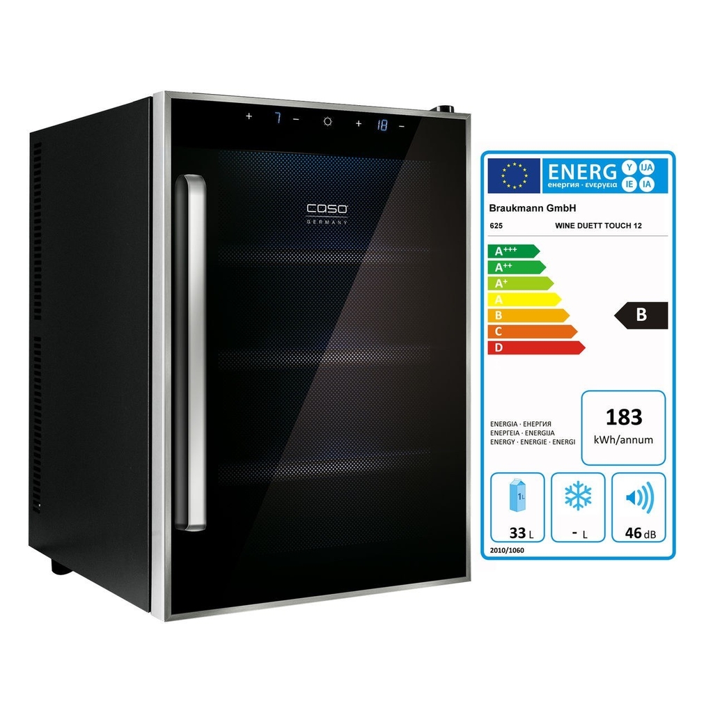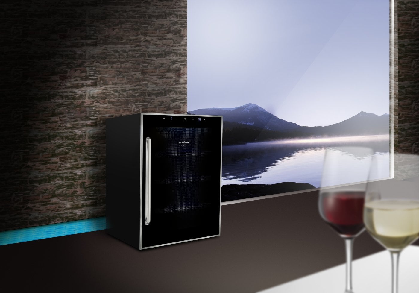 Tủ rượu Caso 12 được sản xuất bằng thép sơn tĩnh điện chất lượng cao, kính chống tia cực tím, có hệ thống lọc chống mùi. Kích thước 345 x 525 x 510mm chia làm hai ngăn, tủ có thể chứa được 12 chai rượu với chiểu cao tiêu chuẩn là 310mm. Công suất 140 wat, độ rung thấp và nhiệt độ điều chỉnh từ 7 - 15 độ C.